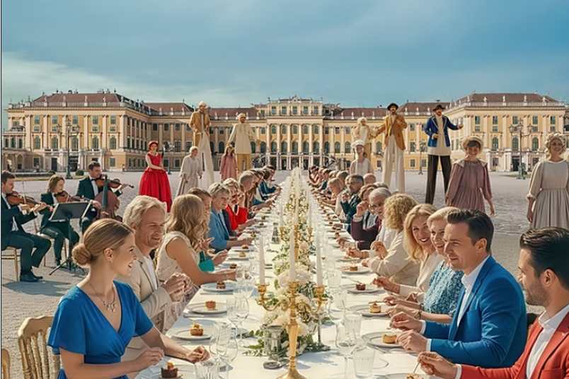 Zamislite veliki dvorac Šenbrun, barokno dvorište i izuzetnu atmosferu koja oduzima dah već u prvom trenutku. Na 110 metara dugoj, raskošno postavljenoj trpezi, ispred dvorca Šenbrun, uživaće oko 360 gostiju, koliko je predviđeno zbog jedinstvenog ambijenta i koncepcije događaja, podeljenih na dve sesije: jednu jutarnju i jednu večernju.